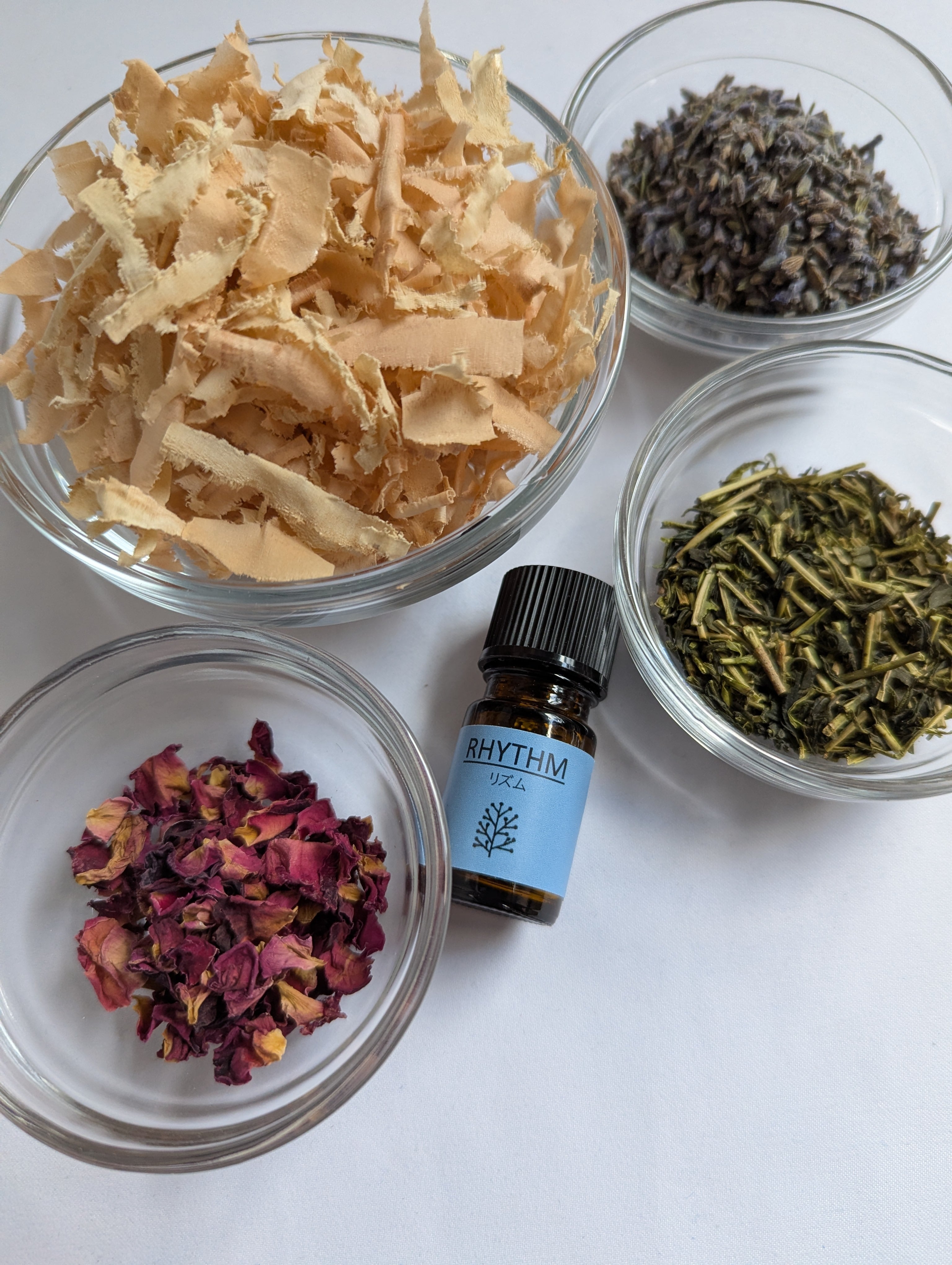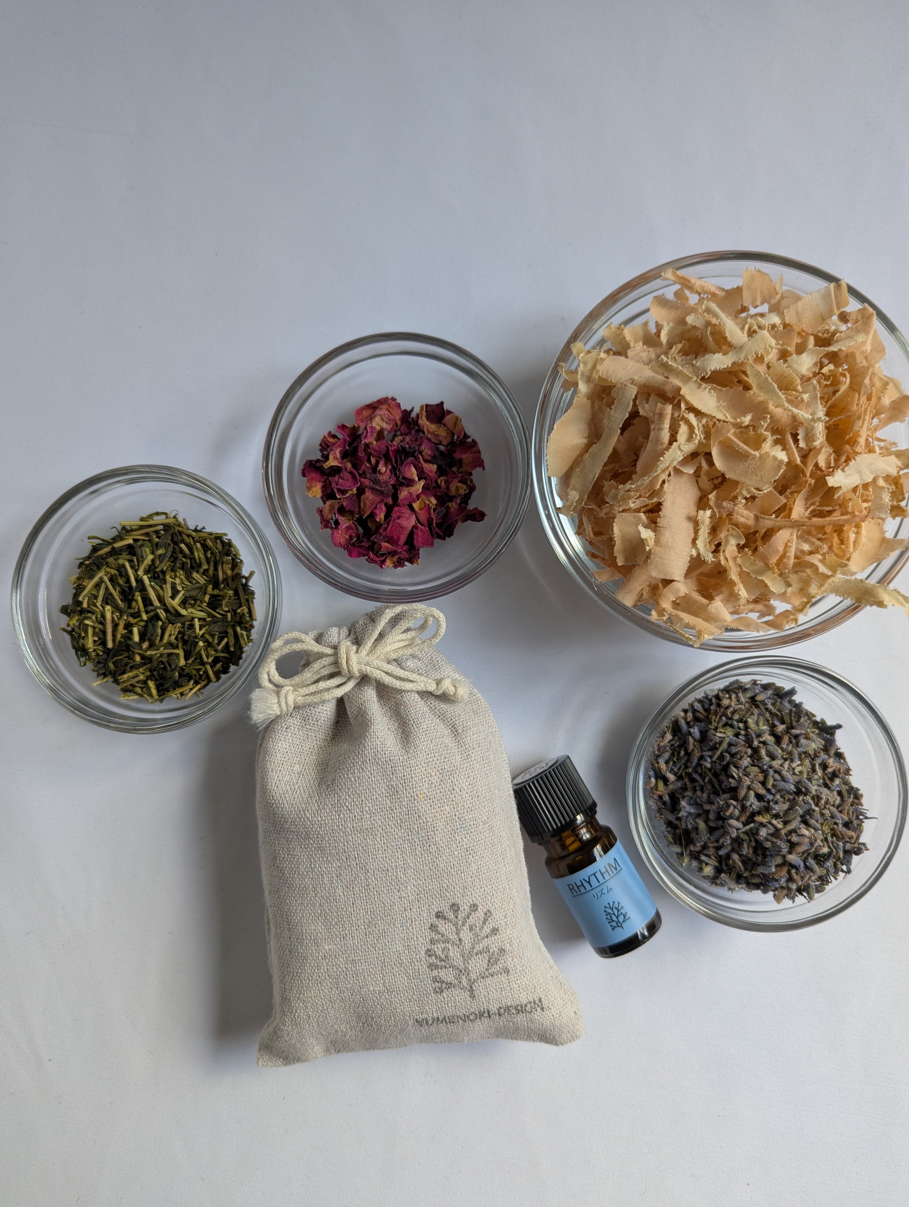 天然乾燥の五木杉と、標高の高い五木村で育てられている松井製茶さんの有機栽培の緑茶に、ラベンダーとローズをブレンド!仕上げにオリジナルブレンドアロマ「リズム」をたっぷり含ませたサシェ(香り袋)を作りました。